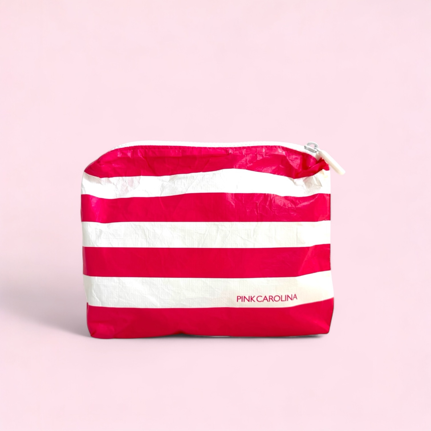 - Our Pink Striped Take Me Anywhere Pouch features a white zipper with Pink and White stripes